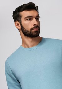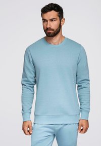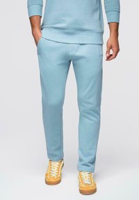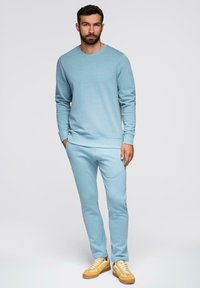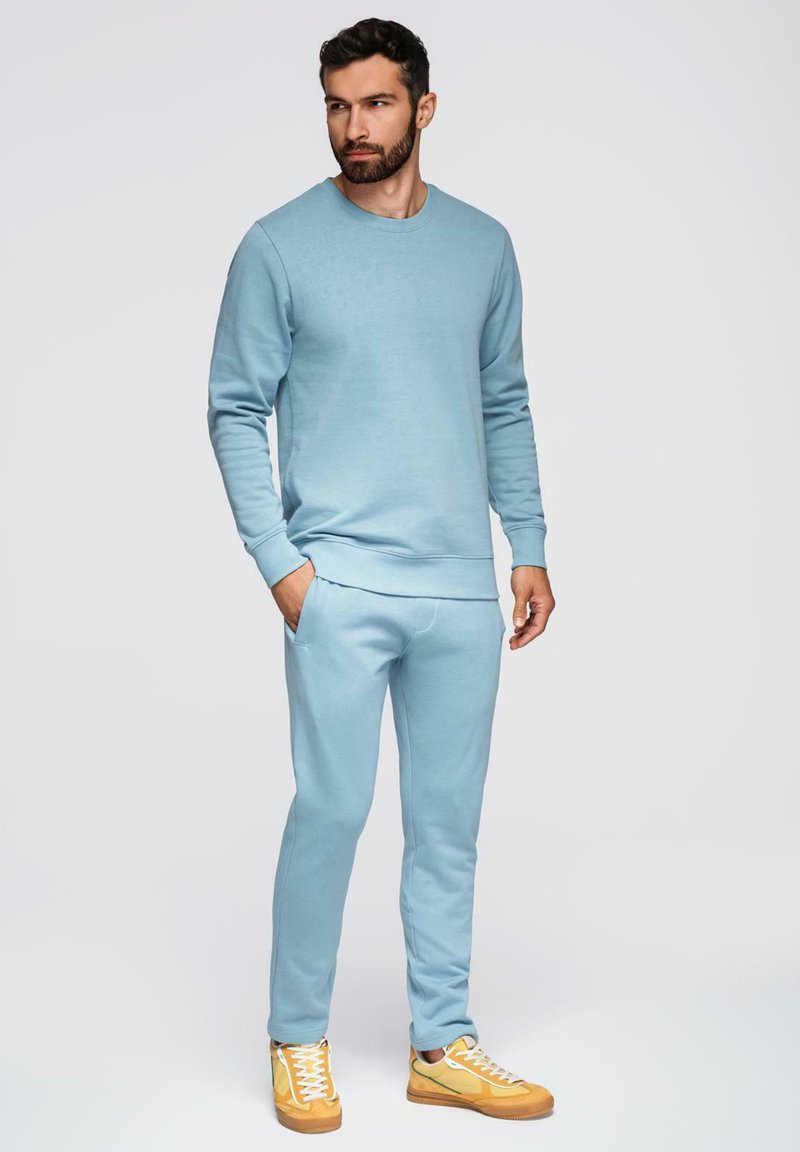 Homme portant un sweat-shirt bleu clair et un pantalon de survêtement assorti avec des baskets jaunes, debout avec une main dans la poche, regardant sur le côté.