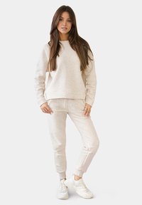 Sweatshirt beige clair avec une finition texturée, épaules tombantes et coupe décontractée ; porté avec un pantalon assorti dans un style décontracté.