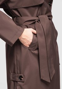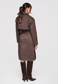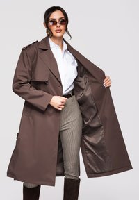 Femme portant un trench-coat marron, une chemise blanche, un pantalon à carreaux, une ceinture noire, des lunettes de soleil et des boucles d'oreilles en or sur un fond uni.