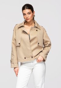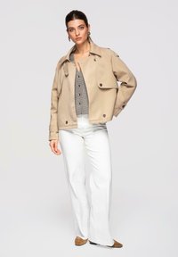 Femme portant un trench-coat court beige par-dessus une chemise à carreaux et un pantalon blanc, posant avec une main dans la poche devant un fond uni.