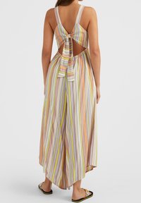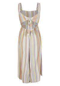 Combinaison rayée avec un décolleté carré, des jambes larges et des poches latérales. Le tissu présente des couleurs pastel, y compris le rose, le jaune et la lavande.
