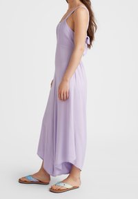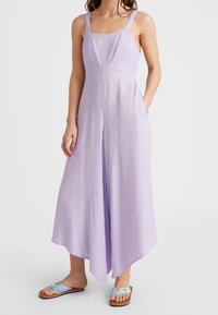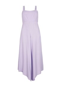 Combinaison lavande à jambes larges, dos ouvert avec un détail de nœud et taille élastique. Tissu léger avec une texture lisse.