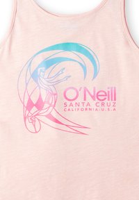 Débardeur rose clair avec un graphisme pastel d'un surfeur chevauchant une vague et le texte "O'Neill Santa Cruz California U.S.A" en rose.