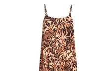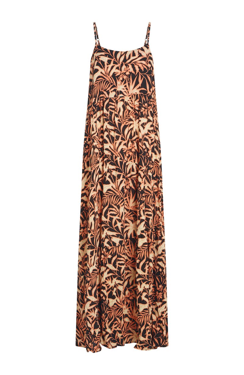 Robe longue sans manches avec fines bretelles, présentant un imprimé intégral de feuilles tropicales en orange et beige sur fond noir.