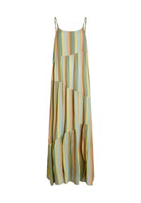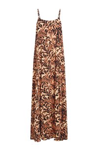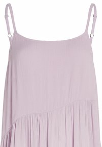 Robe longue maxi sans manches de couleur violet clair avec fines bretelles ajustables et sections fluides à volants.