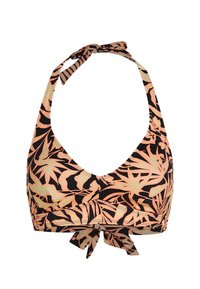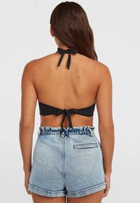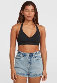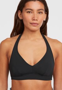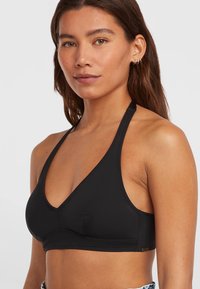 Femme aux longs cheveux bruns portant un soutien-gorge de sport noir à col halter et de petites boucles d'oreilles argentées en forme d'anneau, sur un fond clair uni.