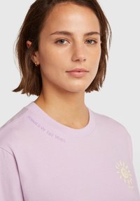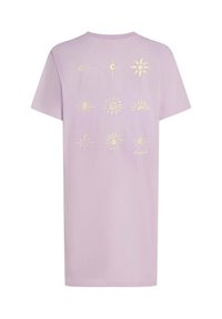 Robe en coton violet clair à manches courtes et col rond. Présente un imprimé graphique de soleil sur la poitrine et des fentes latérales à l'ourlet.