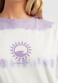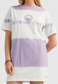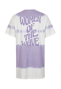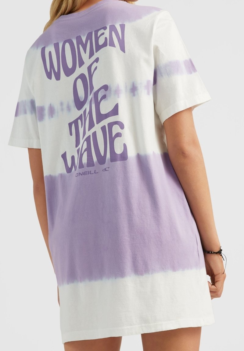 Personne portant une robe à manches courtes en dégradé de couleurs avec des rayures violettes et blanches et le texte "FEMMES DE LA VAGUE" imprimé dans le dos.