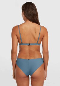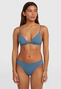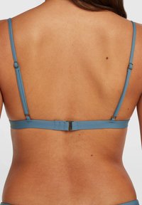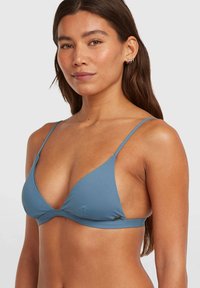 Haut de bikini triangle en tissu bleu doux avec fines bretelles ajustables, présentant une texture lisse et un design minimaliste sans ornements.