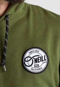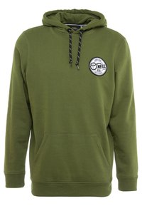 Sweat à capuche vert olive avec une poche avant, un patch logo noir et blanc sur la poitrine, et une capuche à cordon. Tissu doux avec des poignets côtelés.