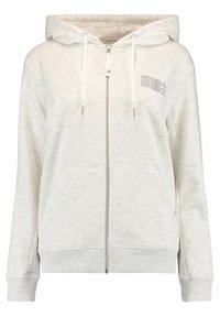Sweat à capuche gris clair avec fermeture éclair, capuche à cordon, poches avant et petit logo "O'Neill" sur le côté gauche de la poitrine.