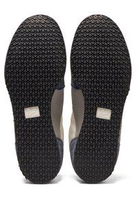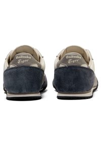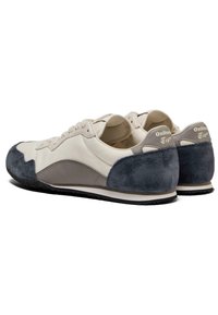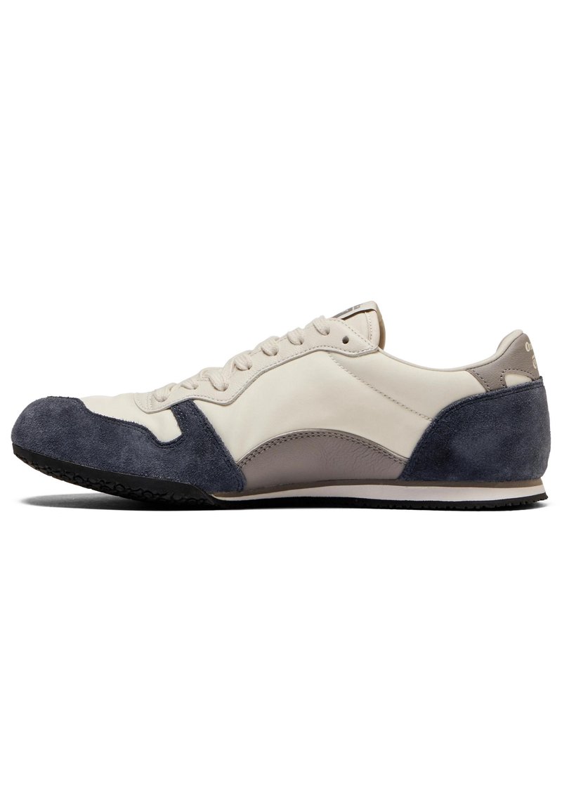 Baskets beige clair avec accents en daim bleu foncé, tige en cuir lisse, semelle en caoutchouc, et un design classique à lacets.