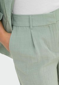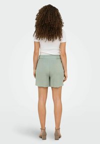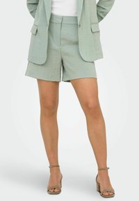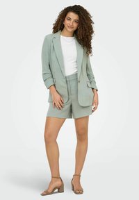 Femme portant un short vert clair sur mesure et un blazer assorti avec des sandales à talons beiges, debout devant un fond uni.