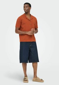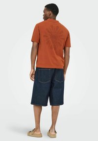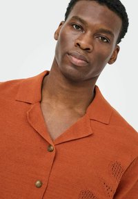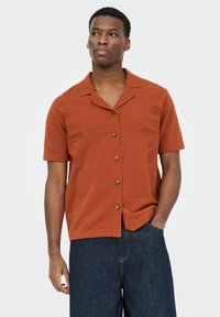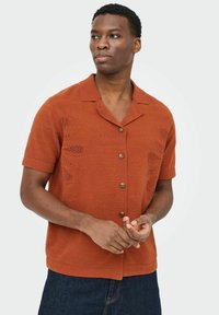 Homme portant une chemise orange rouille à manches courtes avec des motifs texturés, associée à un jean bleu foncé, debout avec une main dans la poche.