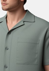 Chemise à manches courtes et à boutons en tissu vert pâle. Présente une poche, un col de style campagnard et un motif texturé. Assortie à un pantalon de couleur claire.