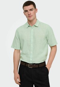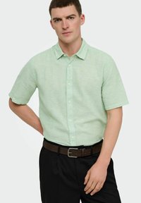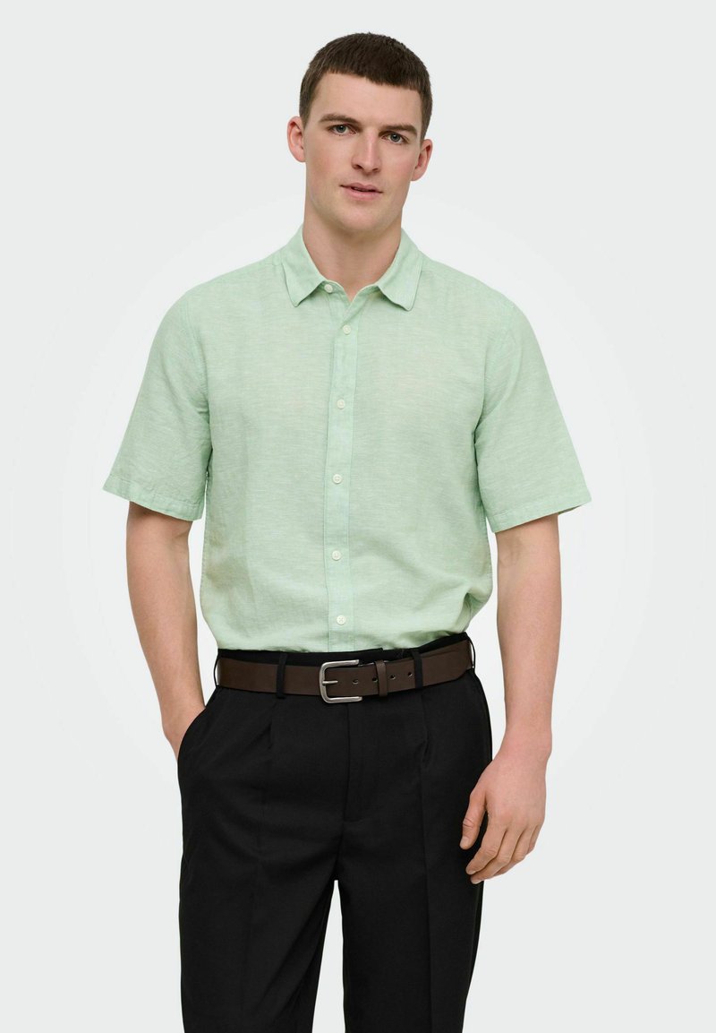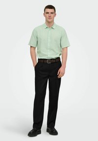 Homme portant une chemise à manches courtes vert clair boutonnée, rentrée dans un pantalon noir avec une ceinture marron, les mains dans les poches, debout devant un fond blanc.