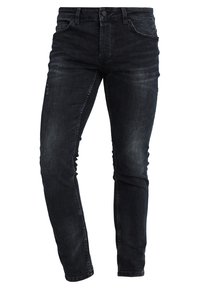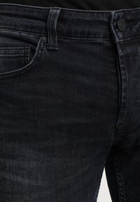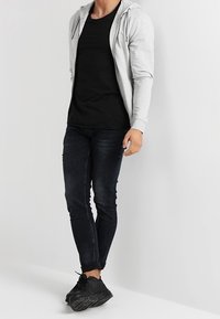 Jean slim délavé foncé avec une texture lisse, cinq poches et une fermeture à bouton. Associé à des baskets de sport noires.
