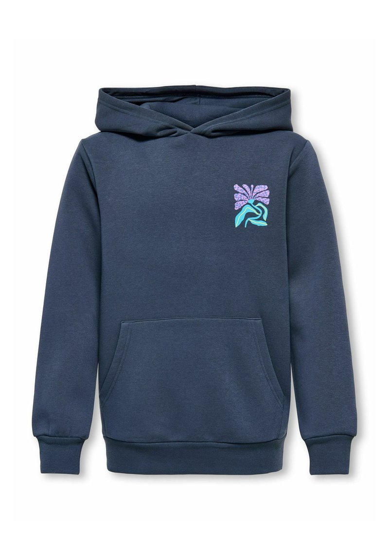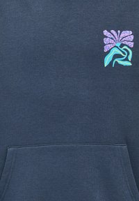 Sweat à capuche bleu marine avec poche kangourou et petit motif floral abstrait en violet et sarcelle sur le côté gauche de la poitrine.