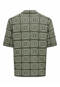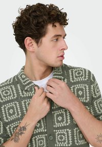Homme debout, de dos, portant une chemise à manches courtes à motifs verts, un pantalon beige et des mocassins marron sur un fond uni.