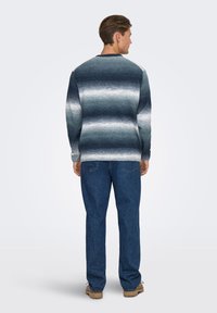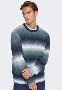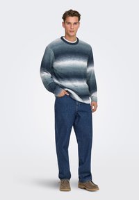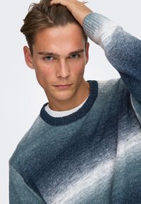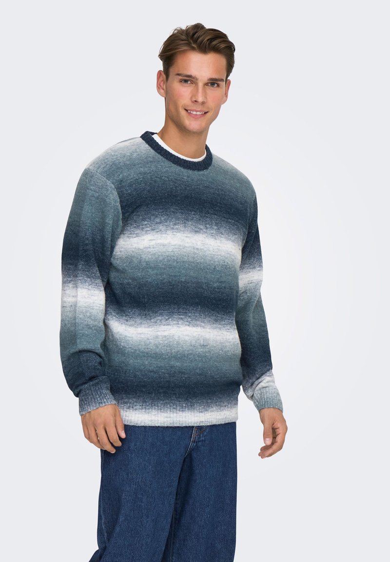 Jeune homme souriant, portant un pull à rayures dégradées bleu et gris et un jean bleu, debout devant un fond clair uni.