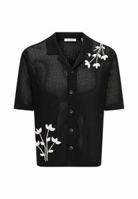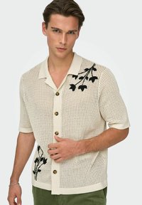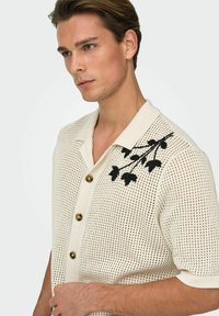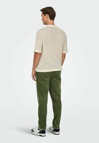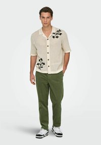 Jeune homme portant une chemise en tricot beige à manches courtes avec une broderie florale noire et un pantalon en velours côtelé vert olive, regardant sur le côté.