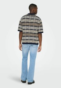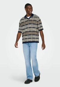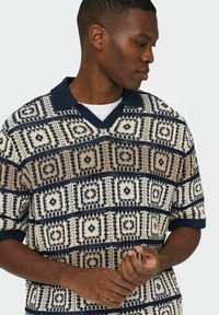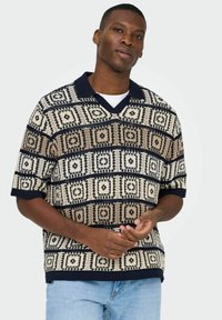 Polo à manches courtes avec motif en beige, marine et crème, ornée de dessins géométriques. Doté d'un col cranté et d'une coupe décontractée.