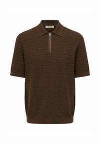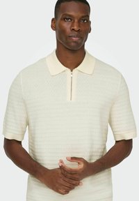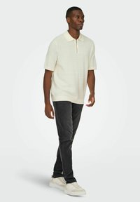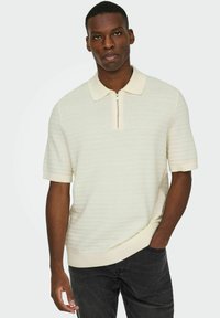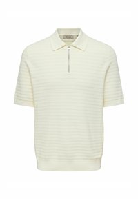 Polo à manches courtes en crème clair avec motif texturé, fermeture à demi-zip, et col et ourlet côtelés. Associé à un jean noir.
