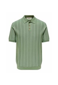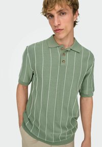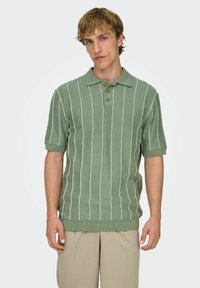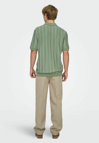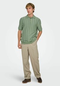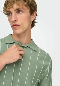 Jeune homme portant un polo vert à manches courtes avec des rayures verticales blanches et un pantalon beige, posant devant un fond clair uni.