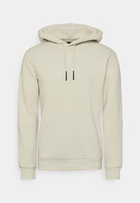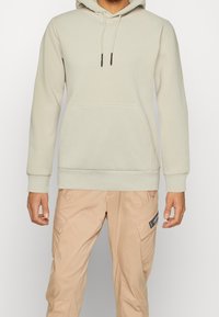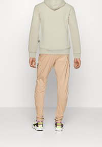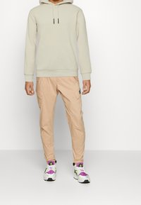 Homme portant un sweat à capuche beige avec poche avant et cordons de serrage, associé à un pantalon cargo marron clair avec poches latérales et une étiquette.