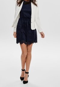 Femme portant une robe en dentelle bleu marine avec un ourlet festonné et un blazer blanc à deux boutons par-dessus, debout devant un fond uni.