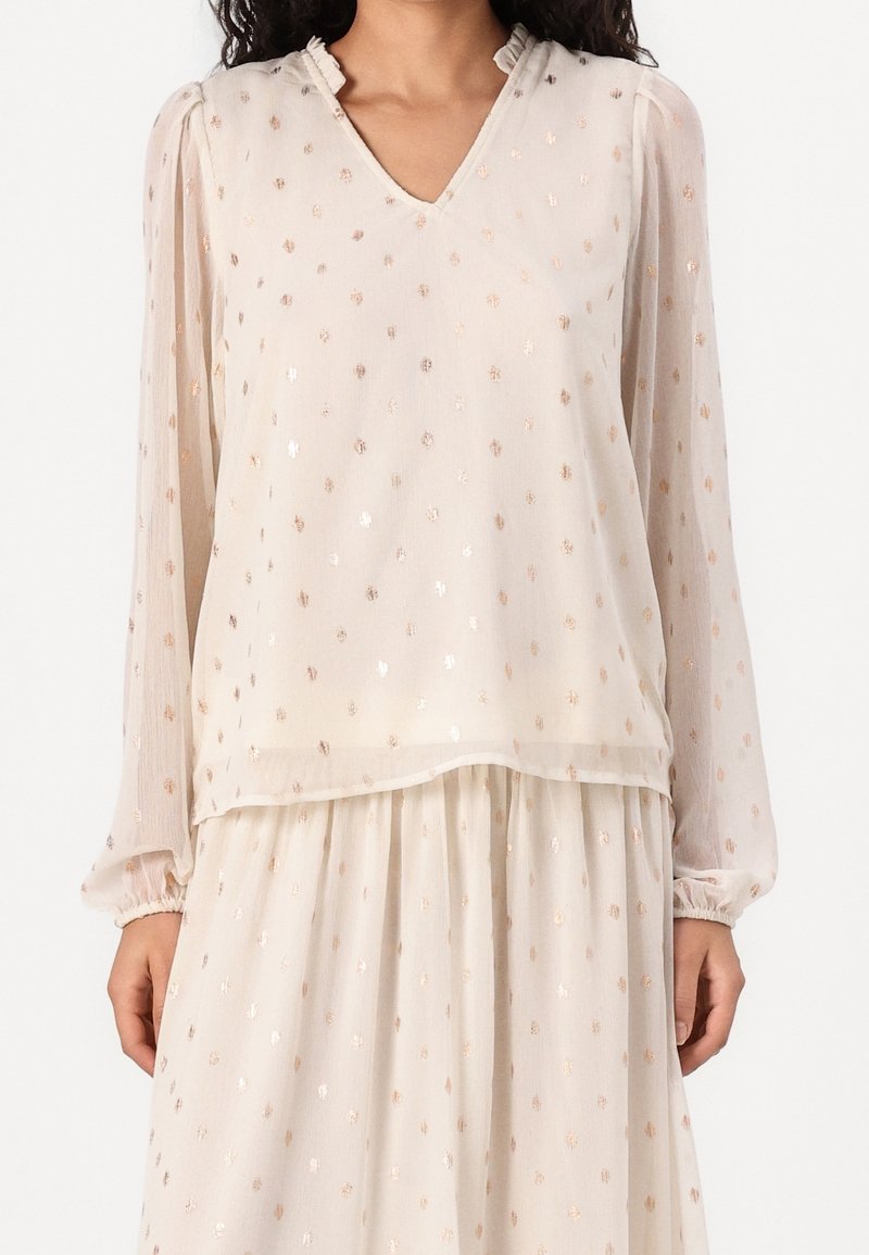Femme portant un ensemble blouse à manches longues et jupe de couleur crème avec des pois métalliques et un col en V à volants, debout les bras le long du corps.