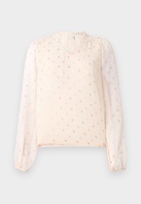 Blouse à manches longues en crème avec un motif paisley coloré en rose, rouge et orange, dotée d'un col froncé et de poignets élastiques.
