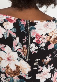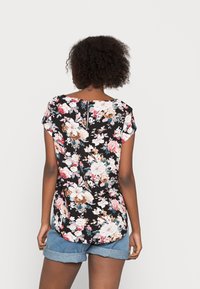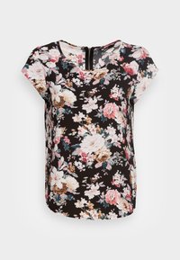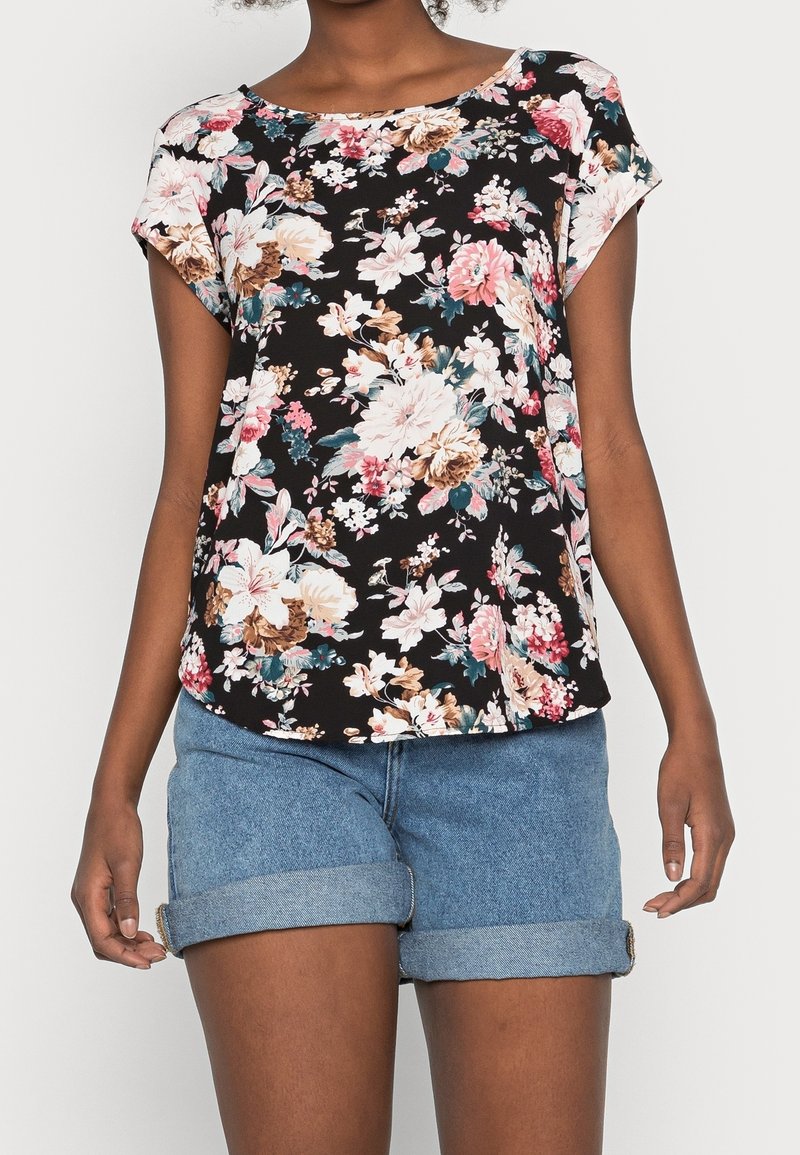 • Blouse noire à motif floral, dotée de manches courtes, d'un col rond et d'un tissu léger avec un motif floral multicolore.