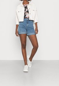 Femme portant un chemisier à manches courtes noir à motifs floraux, associé à un short en jean bleu retroussé, se tenant devant un fond clair uni.