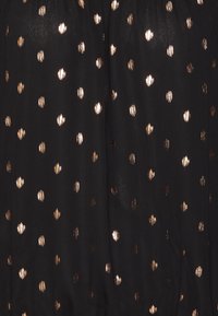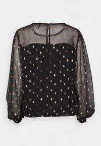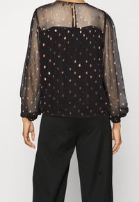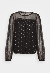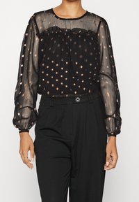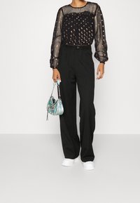 Femme portant un chemisier noir transparent à pois métalliques avec des manches longues bouffantes, associé à un pantalon noir taille haute.