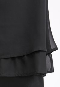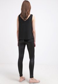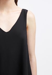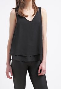 Femme portant un haut noir sans manches à col en V superposé et un pantalon noir ajusté, debout devant un fond blanc uni.