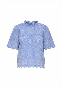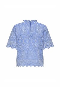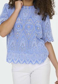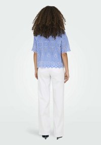 Femme portant un chemisier en dentelle bleu clair à manches courtes avec des motifs géométriques, associé à un pantalon blanc et des bagues en or aux doigts.