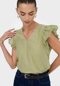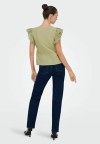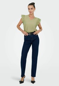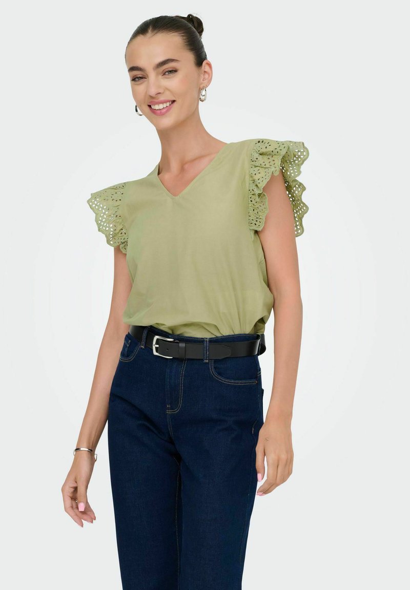Femme souriante portant un chemisier vert clair à col en V avec des manches à volants en œillet, un jean bleu foncé, une ceinture noire et des boucles d'oreilles créoles.