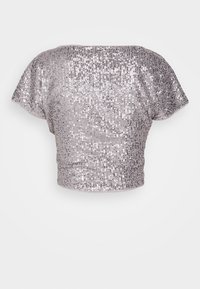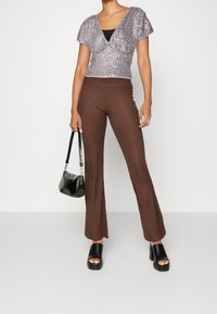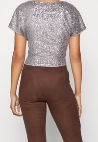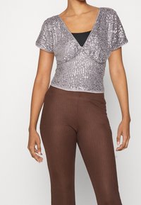 Personne portant un haut argenté à sequins à manches courtes sur un sous-vêtement noir et un pantalon marron côtelé taille haute, debout sur un fond blanc.