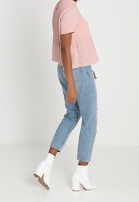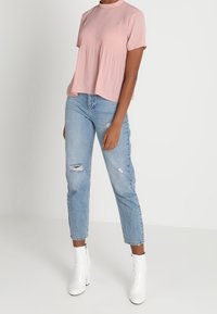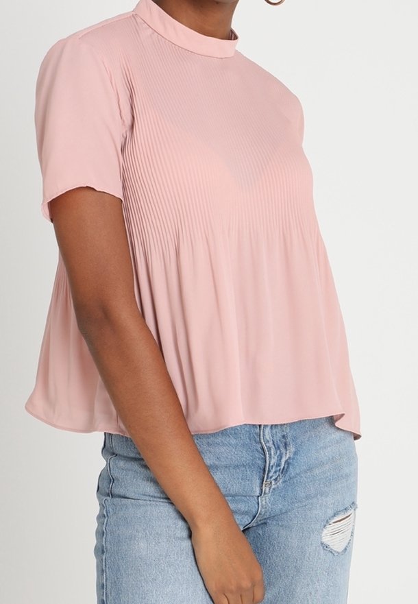Femme portant un chemisier plissé à manches courtes rose clair, associé à un jean en denim bleu clair déchiré, debout devant un fond blanc.