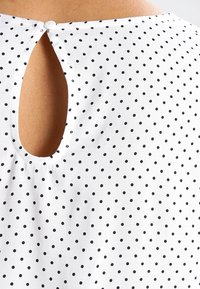 Haut blanc à manches courtes avec des pois noirs. Encolure ronde et tissu doux et léger. Coupe ajustée avec une texture lisse.