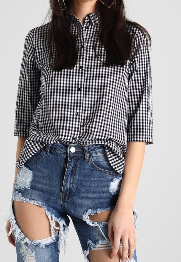 Femme portant une chemise à carreaux noire et blanche à manches trois-quarts avec un jean en denim bleu très déchiré.