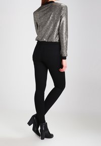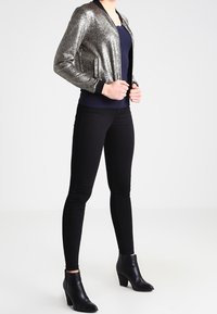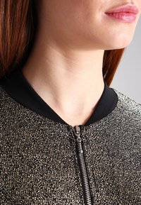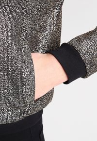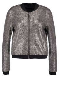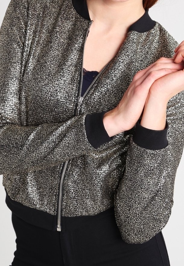 Veste bomber argentée métallique avec une fermeture éclair sur le devant, des poignets et un col côtelés noirs. Confectionnée dans un tissu brillant et texturé ; design court.