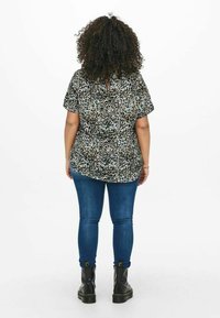 Femme portant un haut à manches courtes à imprimé animalier et un jean bleu déchiré, accessoirisée avec des bagues en or, un bracelet et un collier chaîne.