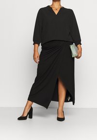 Blouse noire à col en V, manches trois-quarts avec poignets élastiques, et coupe décontractée ; portée avec une jupe noire assortie avec une fente sur le côté.