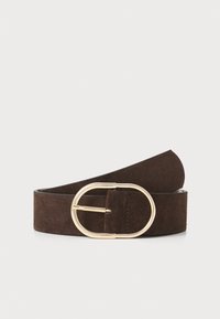 Ceinture en suède marron foncé avec une boucle ronde en métal doré, enroulée sur un fond gris clair.