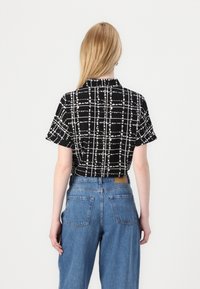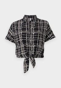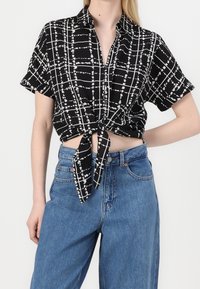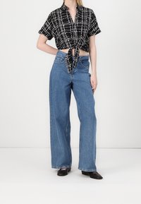 Femme portant une chemise à manches courtes noire et blanche à carreaux nouée à l'avant, associée à un jean bleu ample taille haute, sur fond blanc.