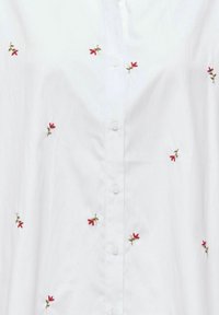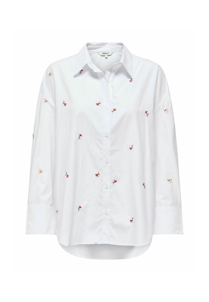 Blouse blanche à manches longues avec boutons, broderie florale rouge et rose clair dispersée sur le devant et les manches, col pointu.