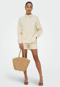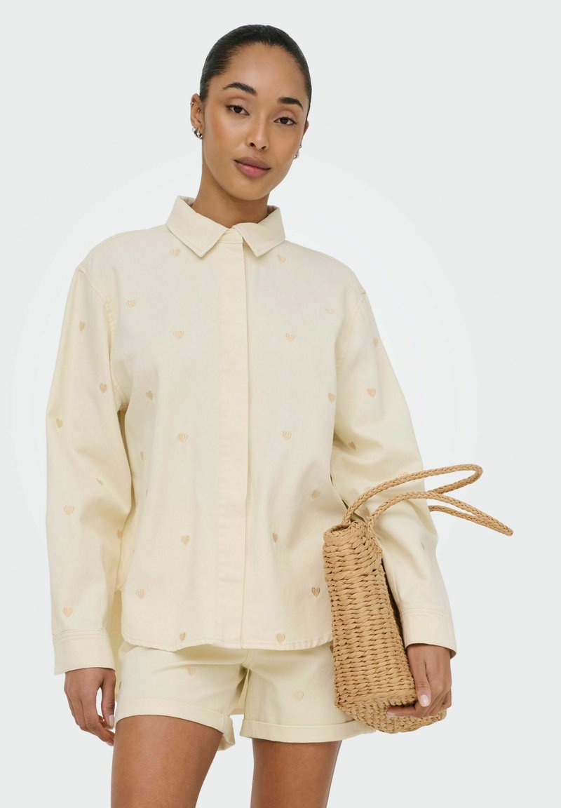 Femme portant une chemise crème boutonnée et un short assorti avec de petits motifs de cœur, tenant un sac à main en paille tressée.