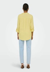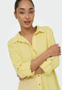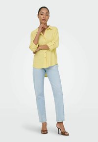 Femme portant une chemise jaune à boutons avec les manches retroussées et un jean bleu clair, debout devant un fond clair uni.
